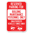 Reserved Parking for Building Maintenance Personnel Only Unauthorized Vehicles Towed Away (With Tow Away Graphic)