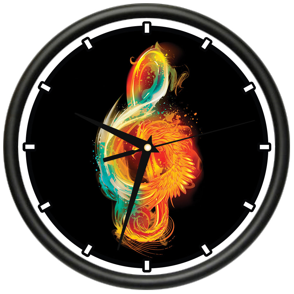 This wall clock measures 10 inches in diameter. It has a black plastic frame with a clear cover. The graphics are rich and vibrant and will last a lifetime.The clock has precision quartz movement and operates on 1 AA battery (not included).