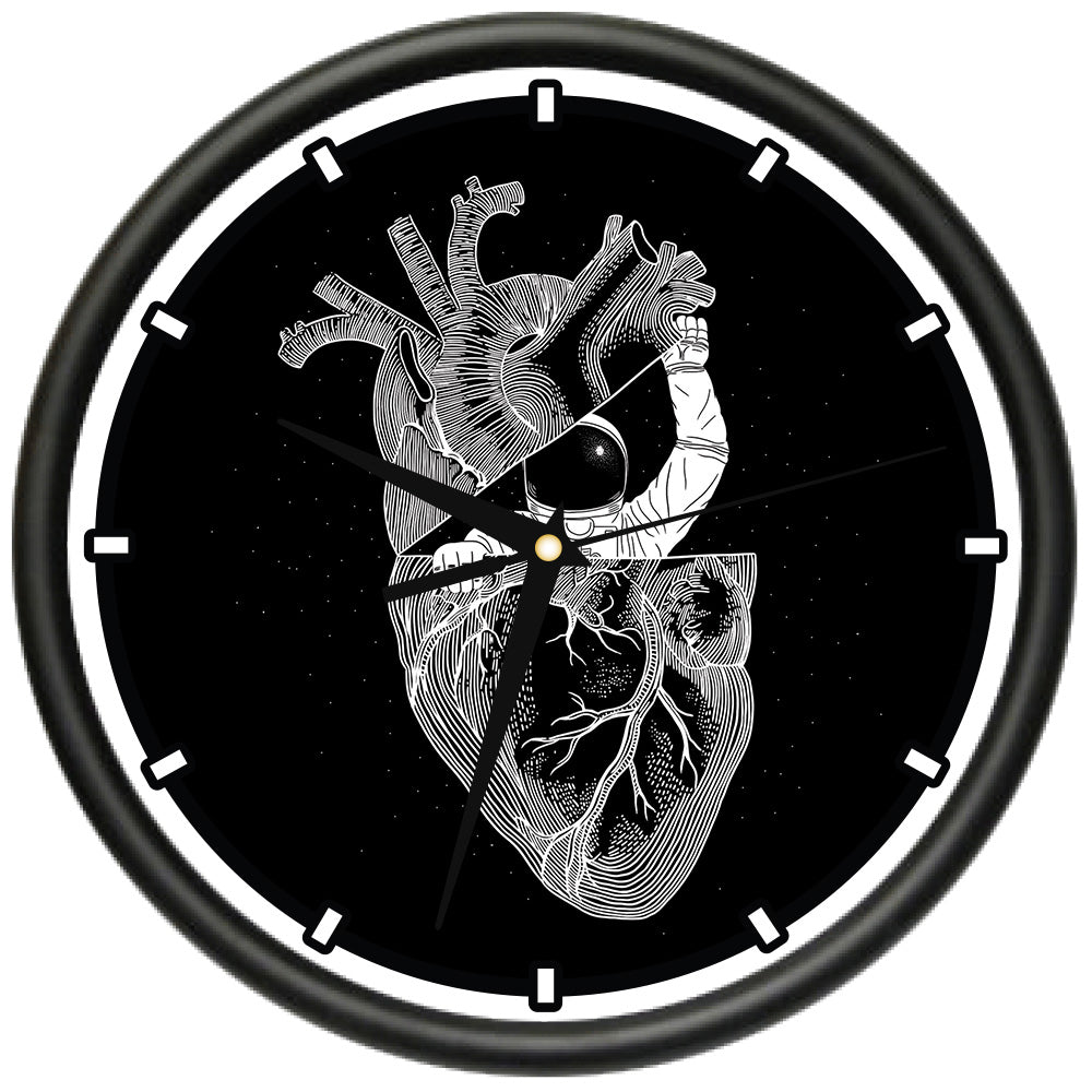 This wall clock measures 10 inches in diameter. It has a black plastic frame with a clear cover. The graphics are rich and vibrant and will last a lifetime.The clock has precision quartz movement and operates on 1 AA battery (not included).