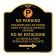 Violators Will Be Towed Away at Vehicle Owner's Expense No Se Estacione Su Vehiculo Sera Remolcado a Costa Suyo - 18" x 18" Designer Aluminum Sign / Black & Gold is backordered and will ship as soon as it is back in stock.