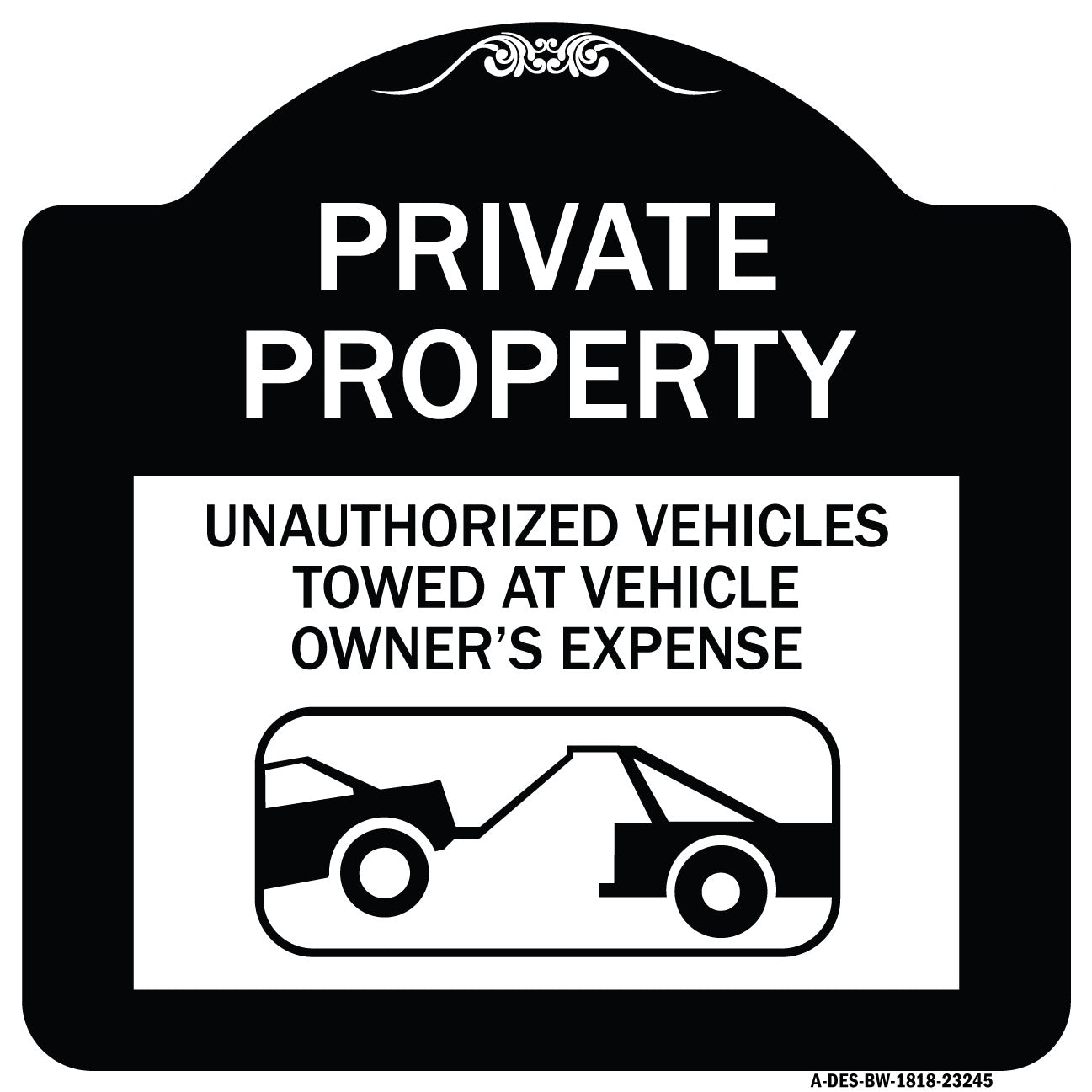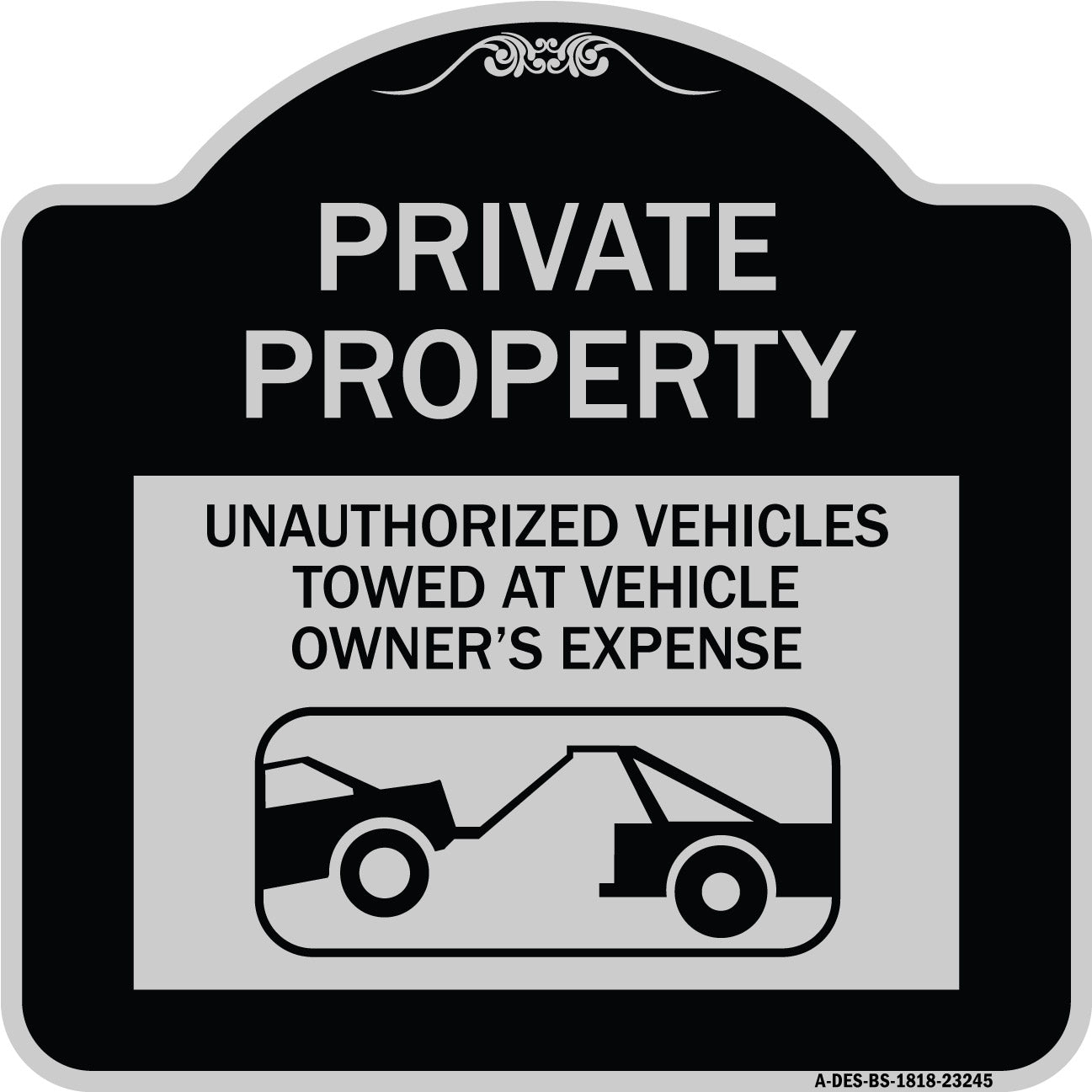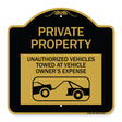 Private Property Unauthorized Vehicles Towed at Owner Expense with Graphic - 18" x 18" Designer Aluminum Sign / Black & Gold is backordered and will ship as soon as it is back in stock.