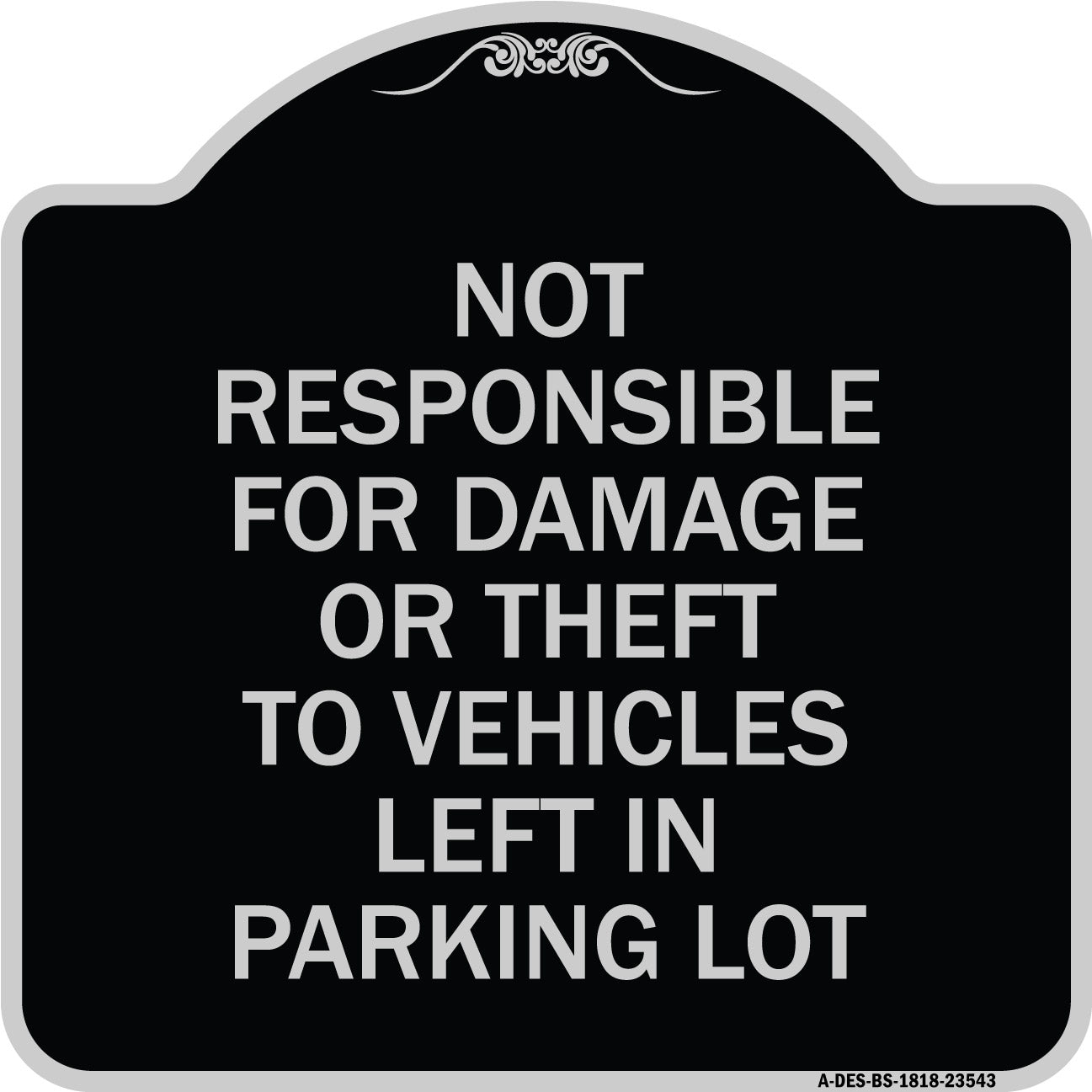 Not Responsible for Damage or Theft to Vehicles Left in Parking Lot - 18" x 18" Designer Aluminum Sign / Black & Gold is backordered and will ship as soon as it is back in stock.