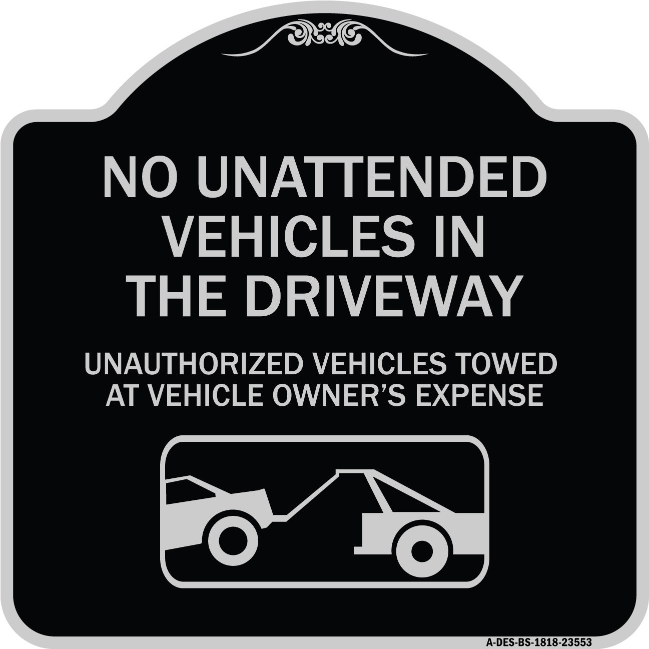 No Unattended Vehicles in the Driveway Unauthorized Vehicles Towed at Vehicle Owner's Expense (With Car Tow Graphic) - 18" x 18" Designer Aluminum Sign / Black & Gold is backordered and will ship as soon as it is back in stock.