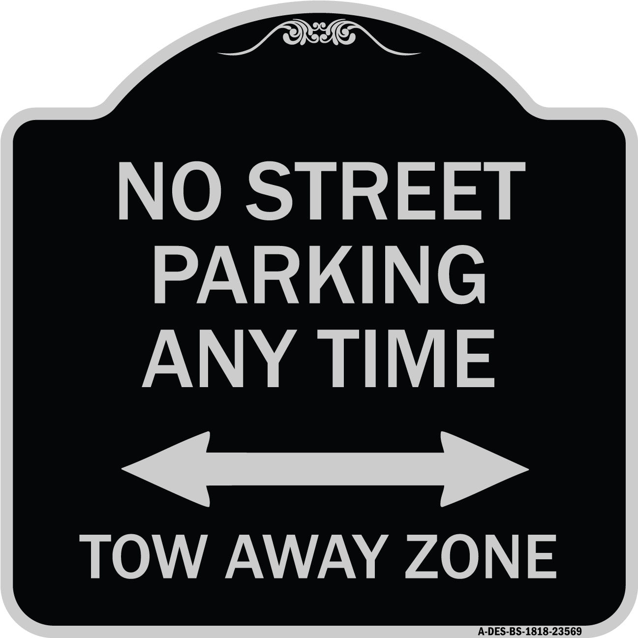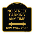 No Street Parking Anytime Tow Away Zone (With Bidirectional Arrow) - 18" x 18" Designer Aluminum Sign / Black & Gold is backordered and will ship as soon as it is back in stock.