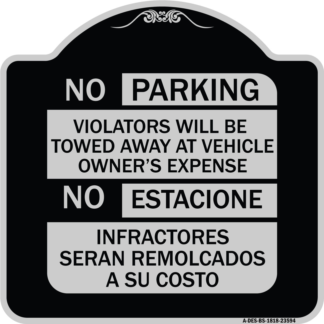 No Parking Violators Will Be Towed Away at Vehicle Owner's Expense - No Estacione Infractores Seran Remolcado a Su Costo - 18" x 18" Designer Aluminum Sign / Black & Gold is backordered and will ship as soon as it is back in stock.