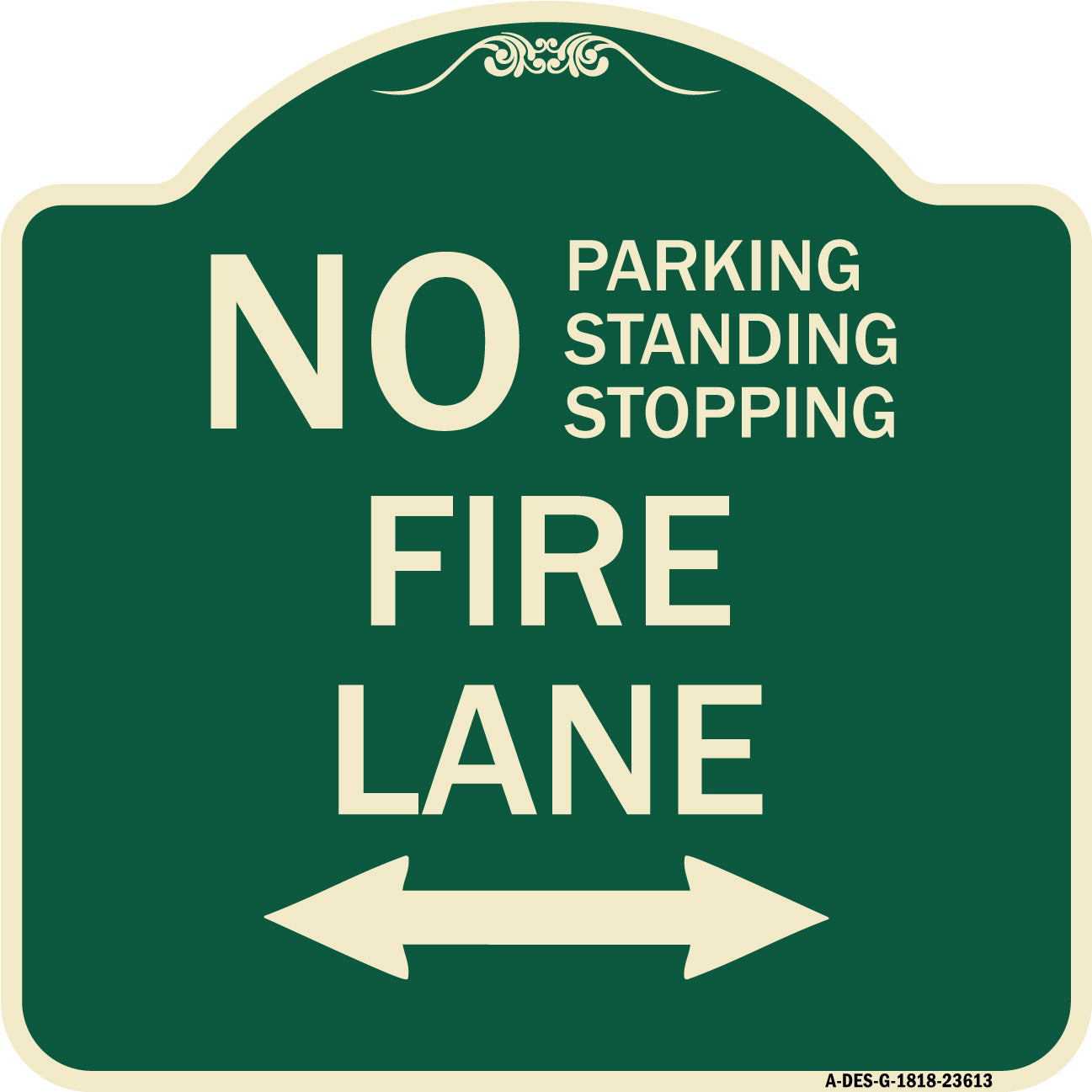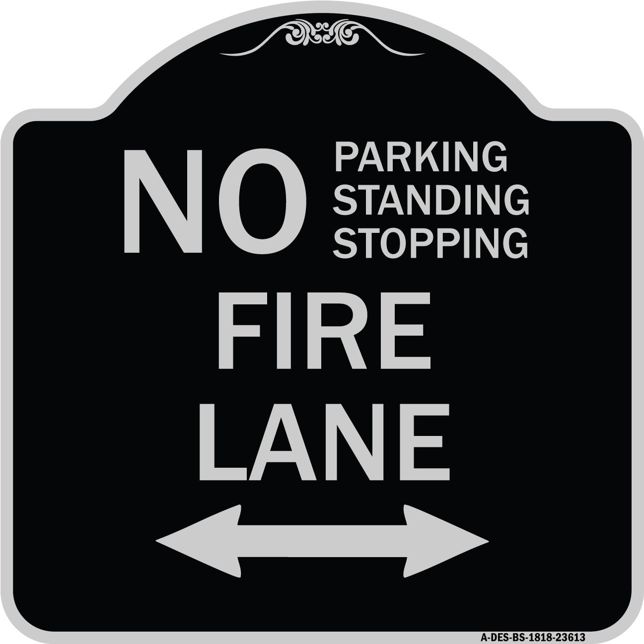 No Parking Standing or Stopping Fire Lane with Bidirectional Arrow - 18" x 18" Designer Aluminum Sign / Black & Gold is backordered and will ship as soon as it is back in stock.