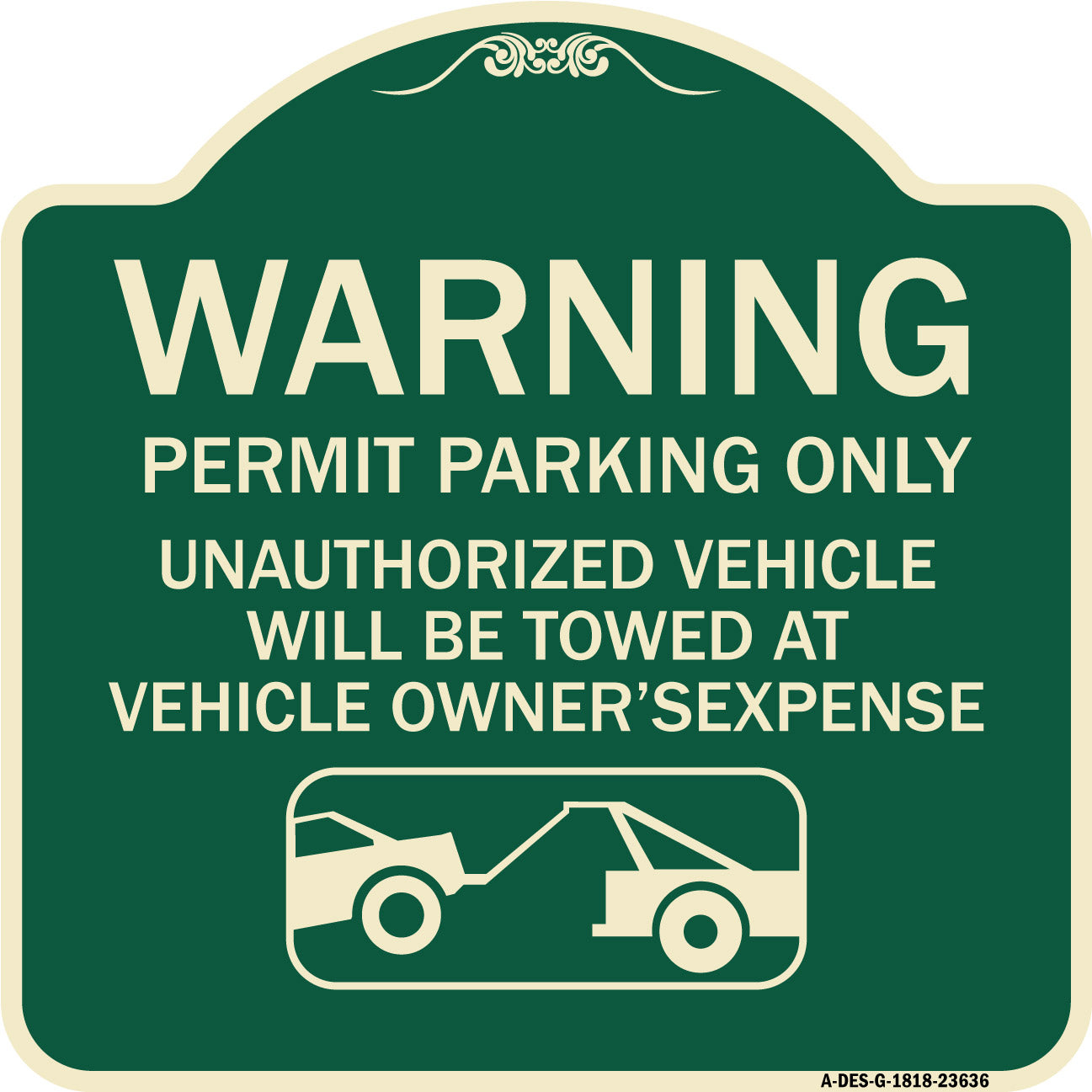 No Parking Without Permit Warning Sign Permit Parking Only Unauthorized Vehicles Will Be Towed at Vehicle Owner's Expense - 18" x 18" Designer Aluminum Sign / Black & Gold is backordered and will ship as soon as it is back in stock.