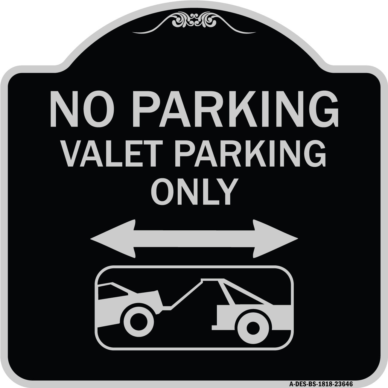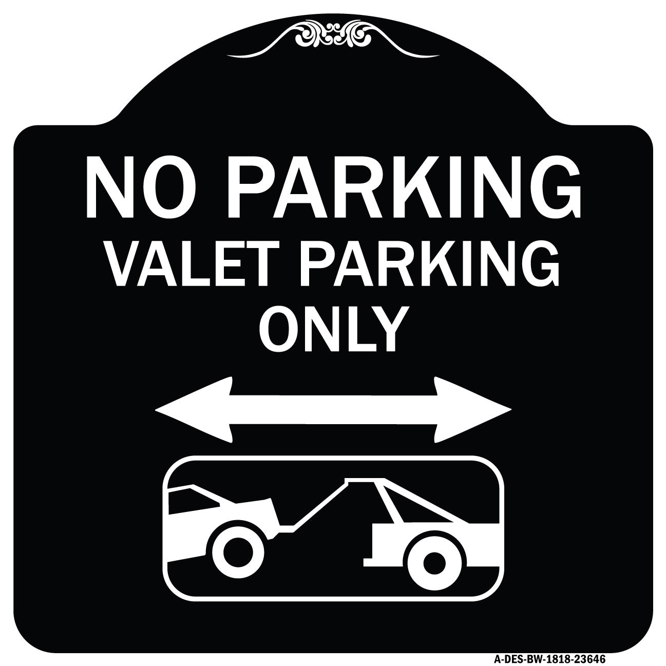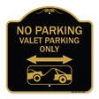 No Parking Valet Parking Only (With Bidirectional Arrow and Car Tow Graphic) - 18" x 18" Designer Aluminum Sign / Black & Gold is backordered and will ship as soon as it is back in stock.