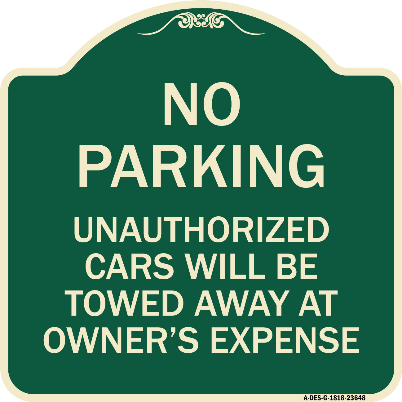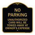 No Parking Unauthorized Cars Will Be Towed Away at Owner's Expense - 18" x 18" Designer Aluminum Sign / Black & Gold is backordered and will ship as soon as it is back in stock.