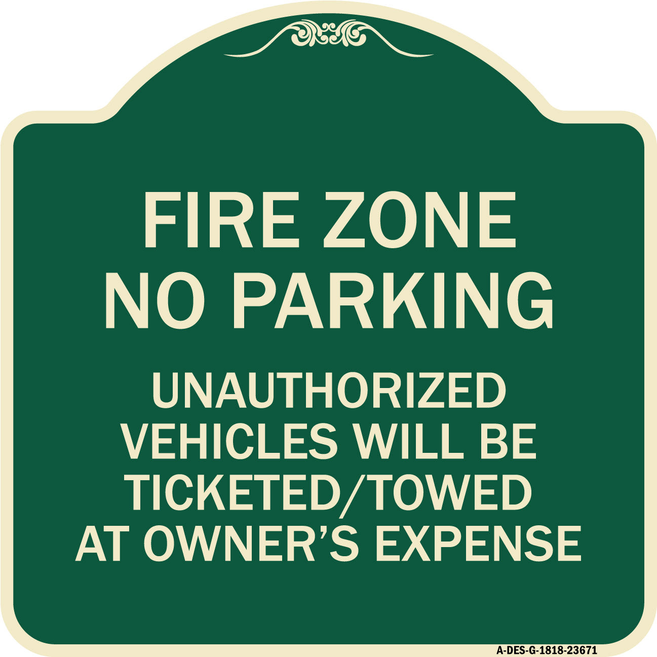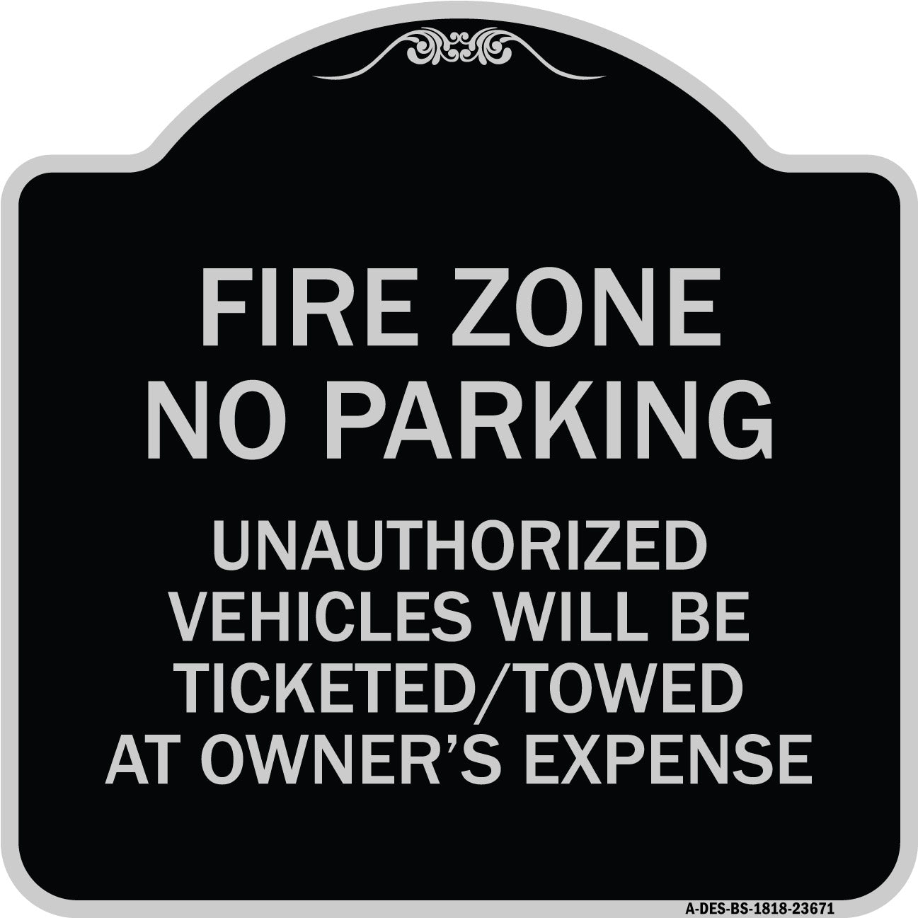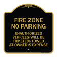 No Parking Sign Fire Zone Unauthorized Vehicles Will Be Ticketed Towed at Owner Expense - 18" x 18" Designer Aluminum Sign / Black & Gold is backordered and will ship as soon as it is back in stock.