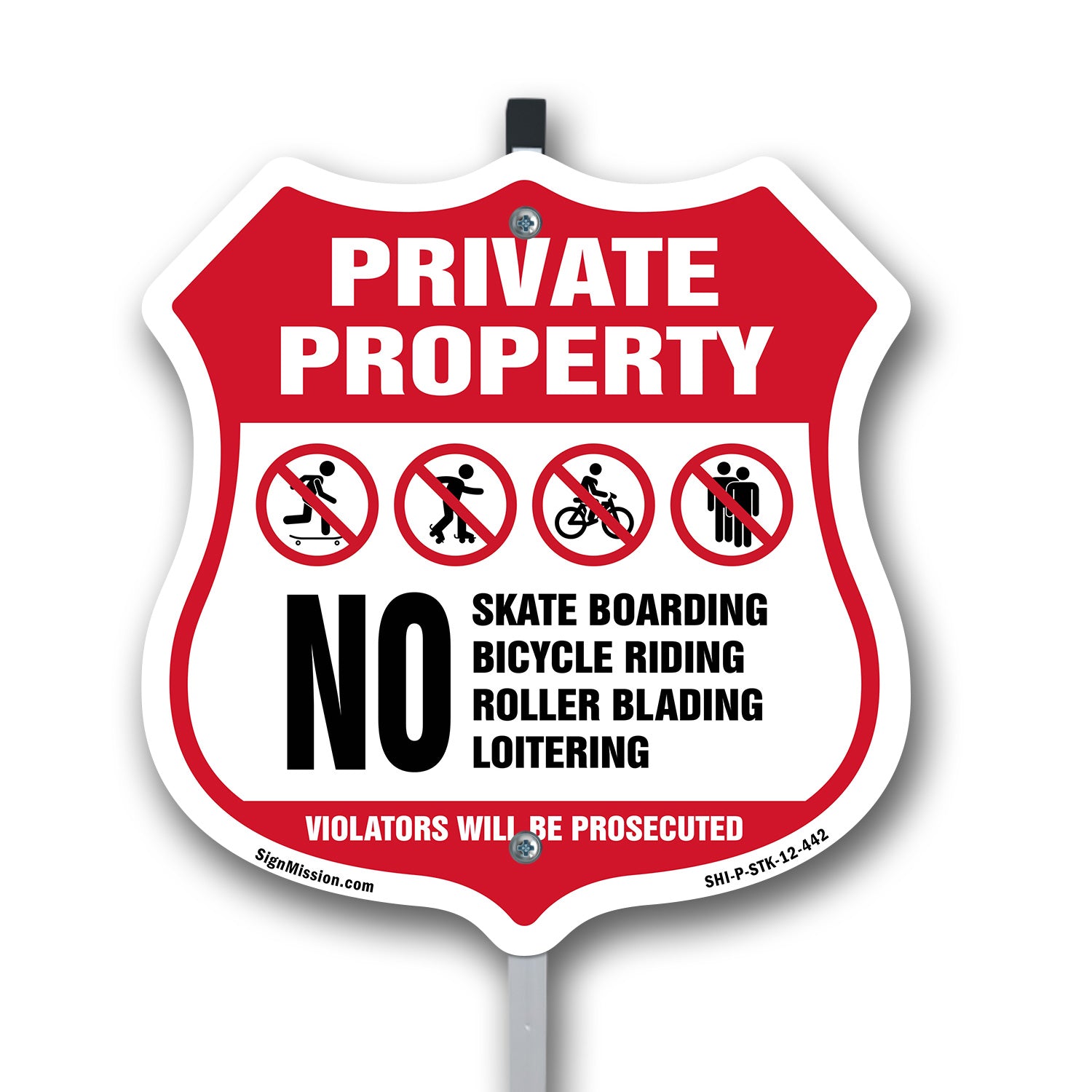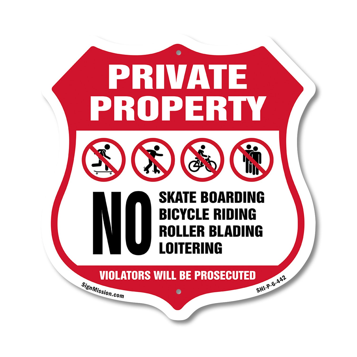 Private Property No Skateboarding Bicycle Riding Roller Blading Loitering. Violators Will Be Prosecuted - Plastic Sign / 6 inch X 6 inch / Sign Only is backordered and will ship as soon as it is back in stock.