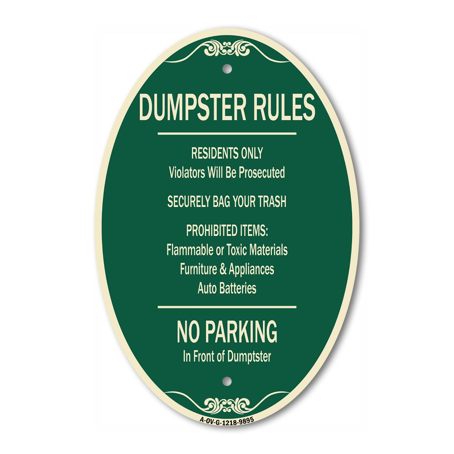 Residents Only Violators Prosecuted Bag Your Trash No Parking In Front Of Dumpster - 12" X 18" Oval is backordered and will ship as soon as it is back in stock.