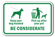 Keep Your Dog Leashed, Pick Up After Your Pet. Be Considerate.