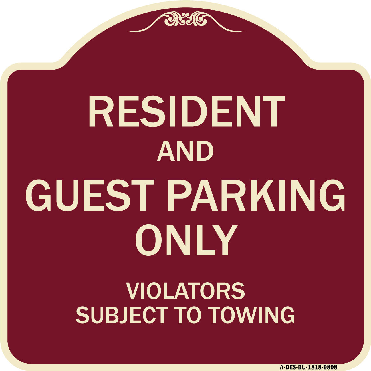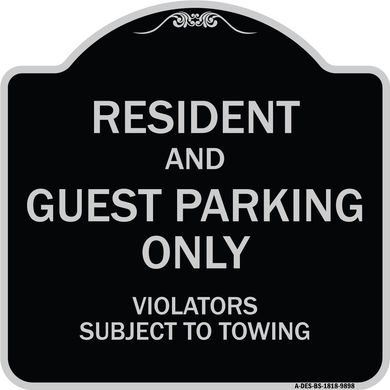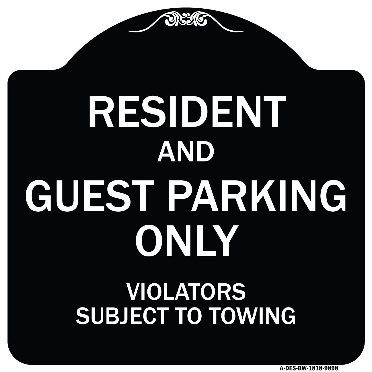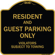 Resident And Guest Parking Only Violators Subject To Towing - 18" x 18" Designer Aluminum Sign / Black & Gold is backordered and will ship as soon as it is back in stock.