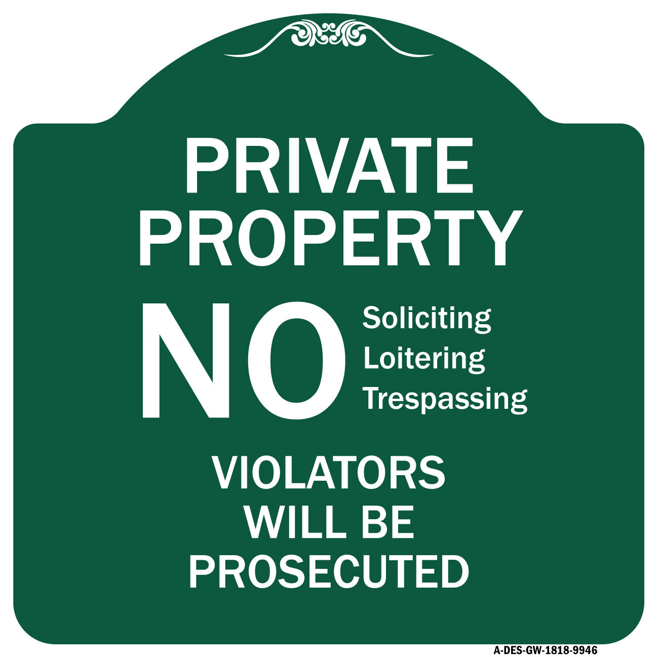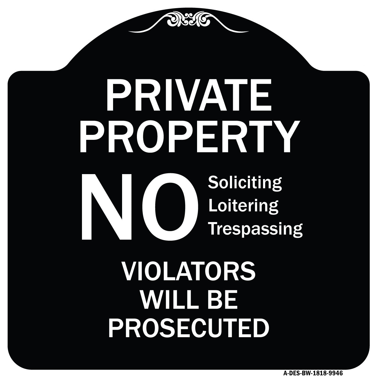 No Soliciting Loitering Trespassing. Violators Will Be Prosecuted - 18" x 18" Designer Aluminum Sign / Black & Gold is backordered and will ship as soon as it is back in stock.