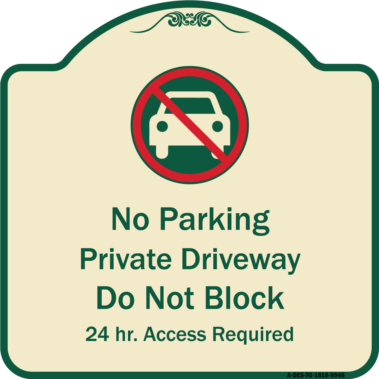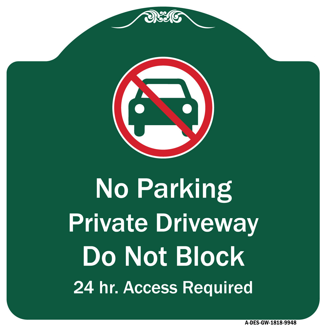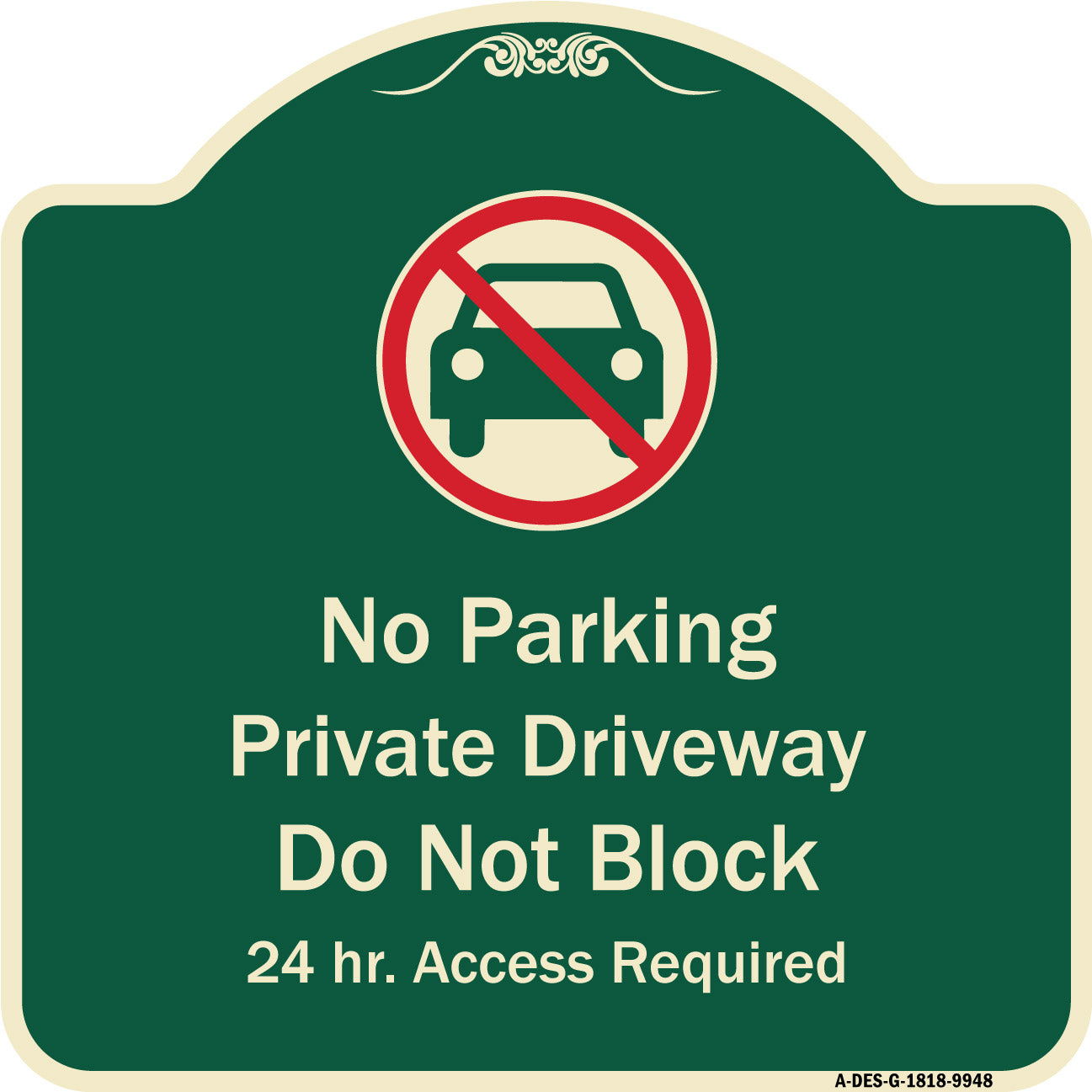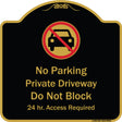 No Parking Private Driveway Do Not Block 24 Hour Access Required - 18" x 18" Designer Aluminum Sign / Black & Gold is backordered and will ship as soon as it is back in stock.