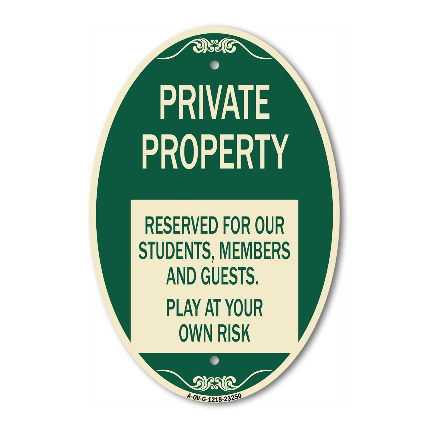 Private Property - Reserved for Our Students Members and Guests - Play at Your Own Risk - 12" X 18" Oval is backordered and will ship as soon as it is back in stock.