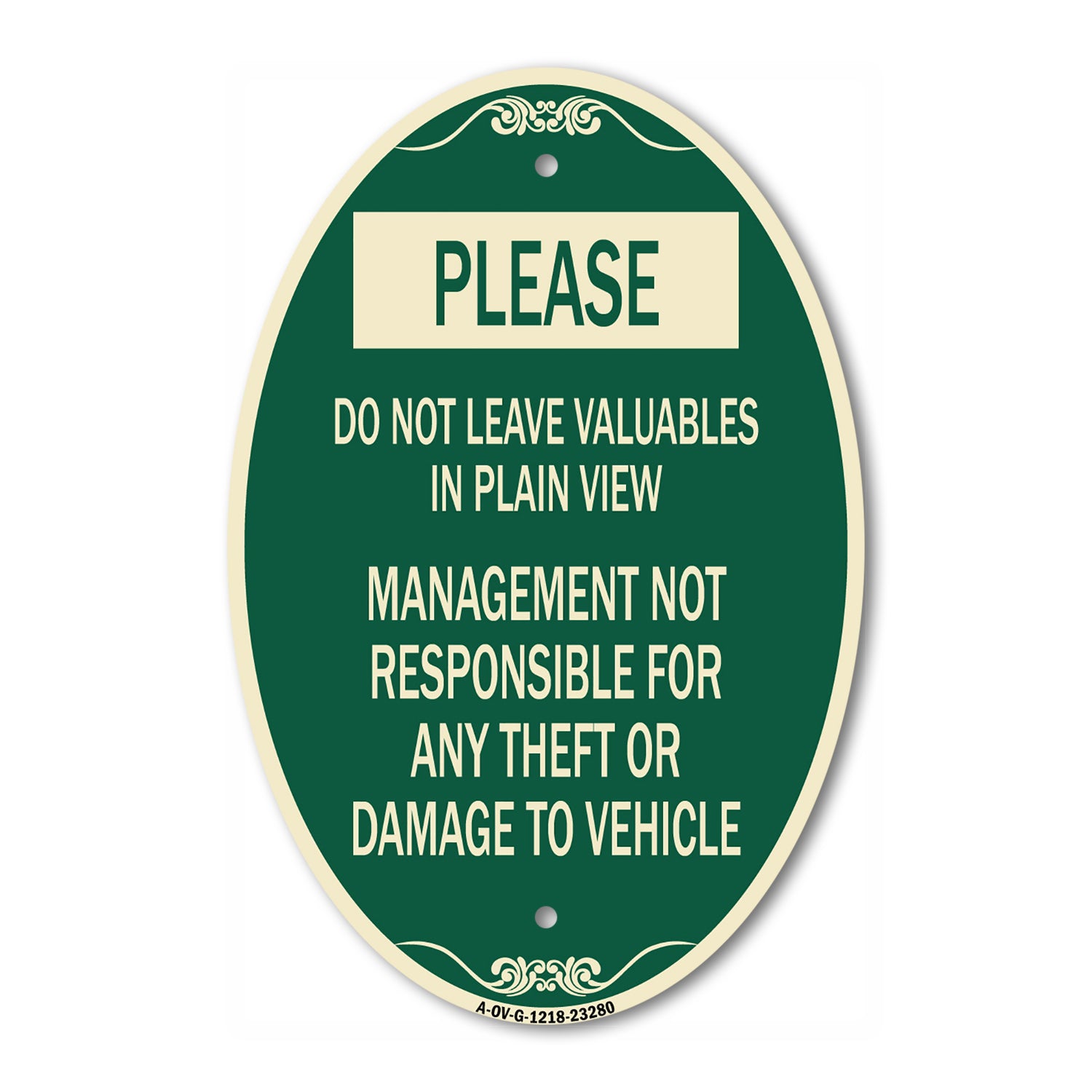 Introducing SignMission's Designer Series Oval Heavy-Gauge Aluminum Signs This Green & Tan 12" x 18" oval sign is manufactured from heavy-gauge, commercial-grade aluminum and built to withstand the toughest outdoor conditions. Designed with laser-cut mounting holes for clean installation and a sleek, architectural appearance. A Premium Solution for HOAs, Golf Courses, and Commercial Properties American-Made Quality You Can Trust Clean, Versatile Installation Safety, Compliance & Peace of Mind Product Specifications: Dimensions: 12" x 18" Oval Material: Heavy-Gauge Aluminum Edges: Smooth oval shape for a clean, professional finish Mounting: Precision laser-cut holes for seamless installation Durability: Made from high-grade, corrosion-resistant aluminum for long-lasting outdoor performance Applications: Suitable for residential communities, commercial facilities, recreational areas, and municipalities SignMission — Precision signage, made in the USA. Built to perform.