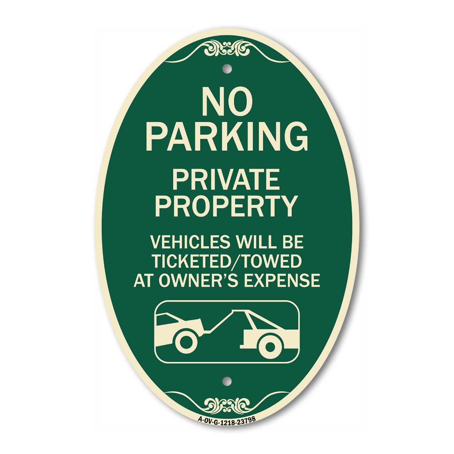 No Parking - Private Property Vehicles Will Be Ticketed Towed at Owner's Expense (With Car Tow Graphic) - 12" X 18" Oval is backordered and will ship as soon as it is back in stock.