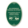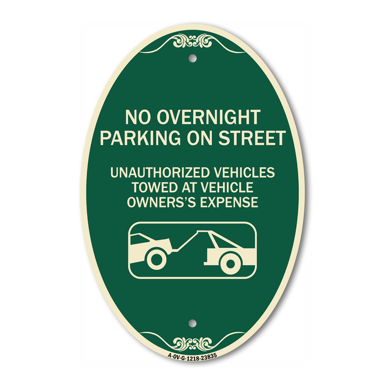 No Overnight Parking on Street Unauthorized Vehicles Towed at Vehicle Owner's Expense (With Car Tow Graphic) - 12" X 18" Oval is backordered and will ship as soon as it is back in stock.