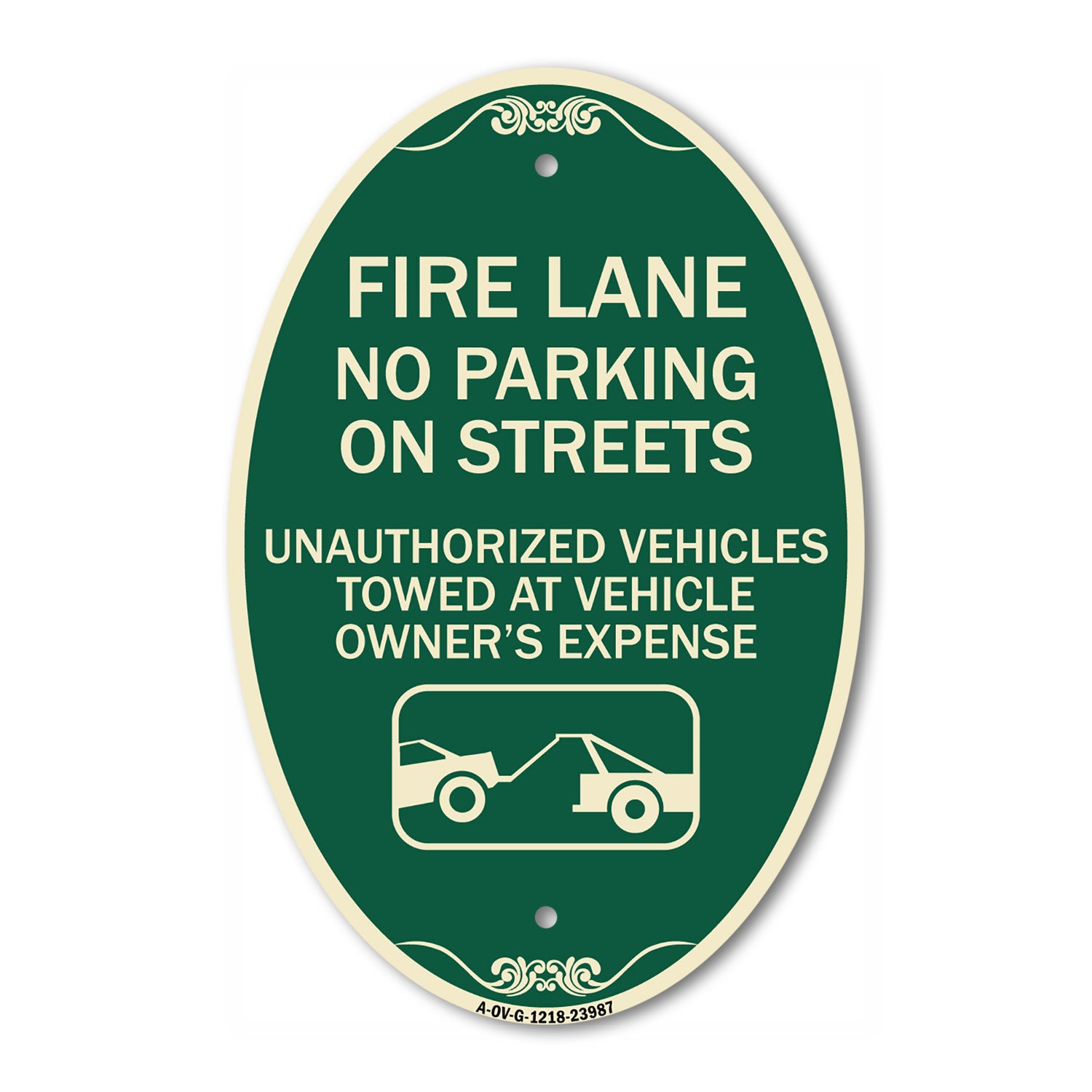 Fire Lanes No Parking on Streets Unauthorized Vehicles Towed at Owner Expense with Graphic - 12" X 18" Oval is backordered and will ship as soon as it is back in stock.