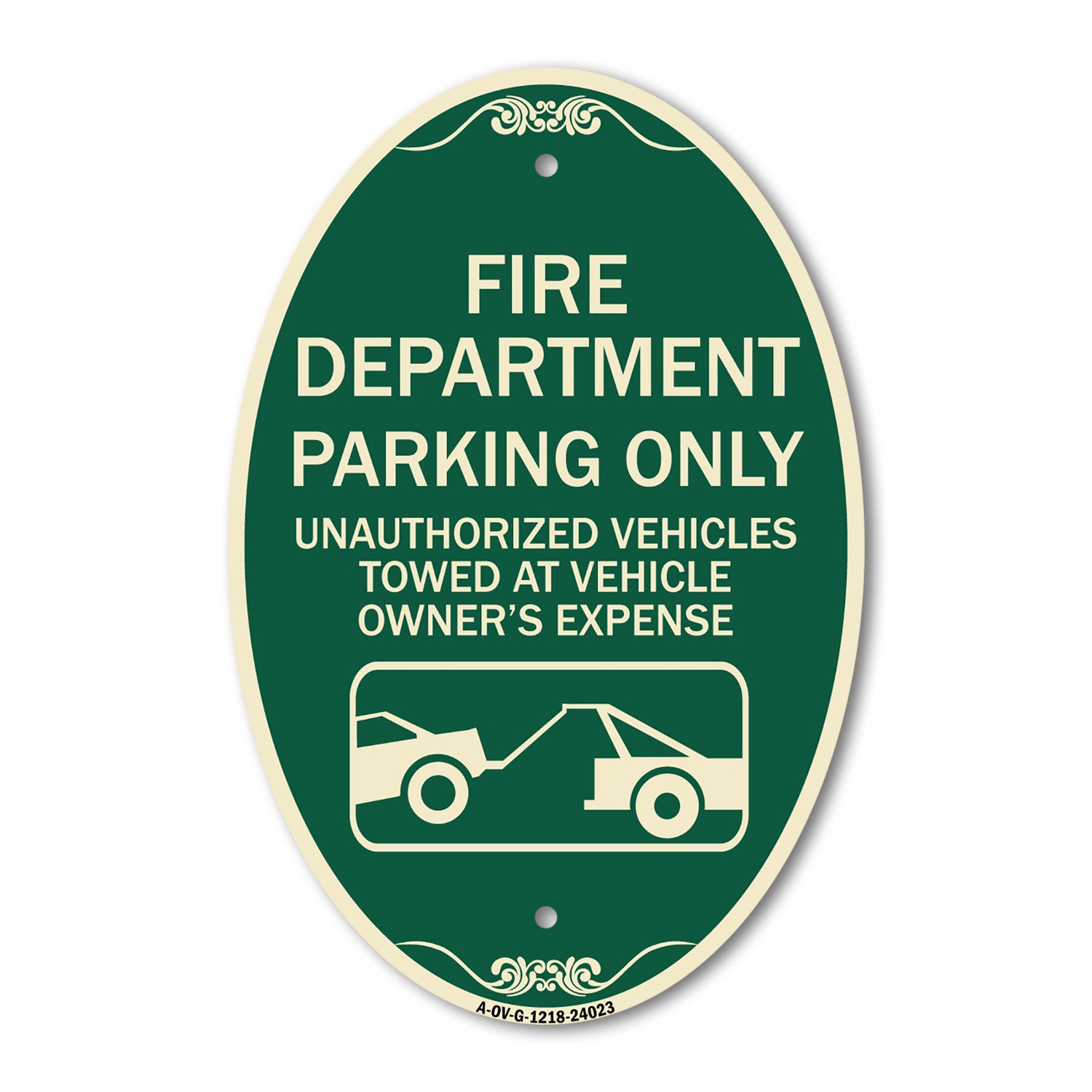 Fire Department Parking Only Unauthorized Vehicles Towed at Owner Expense with Graphic - 12" X 18" Oval is backordered and will ship as soon as it is back in stock.