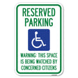 Reserved Parking - (With Handicap Symbol) Warning This Space Is Being Watched by Concerned Citizens - 12" x 18" Heavy Gauge Aluminum Sign is backordered and will ship as soon as it is back in stock.