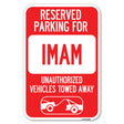 Reserved Parking for Imam Unauthorized Vehicles Towed Away (With Tow Away Graphic) - 12" x 18" Heavy Gauge Aluminum Sign is backordered and will ship as soon as it is back in stock.
