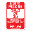 Reserved Parking for Compact Car Only Unauthorized Vehicles Towed Away (With Tow Away Graphic) - 12" x 18" Heavy Gauge Aluminum Sign is backordered and will ship as soon as it is back in stock.