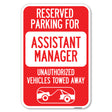 Reserved Parking for Assistant Manager, Unauthorized Vehicles Towed Away (With Car Tow Graphic) - 12" x 18" Heavy Gauge Aluminum Sign is backordered and will ship as soon as it is back in stock.