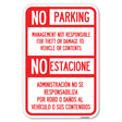 No Parking Management Not Responsible for Theft or Damage to Vehicle or Contents - 12" x 18" Heavy Gauge Aluminum Sign is backordered and will ship as soon as it is back in stock.