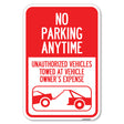 No Parking Anytime, Unauthorized Vehicles Towed at Vehicle Owner's Expense (With Car Tow Graphic - 12" x 18" Heavy Gauge Aluminum Sign is backordered and will ship as soon as it is back in stock.