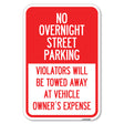 No Overnight Street Parking Violators Will Be Towed Away at Vehicle Owner's Expense - 12" x 18" Heavy Gauge Aluminum Sign is backordered and will ship as soon as it is back in stock.