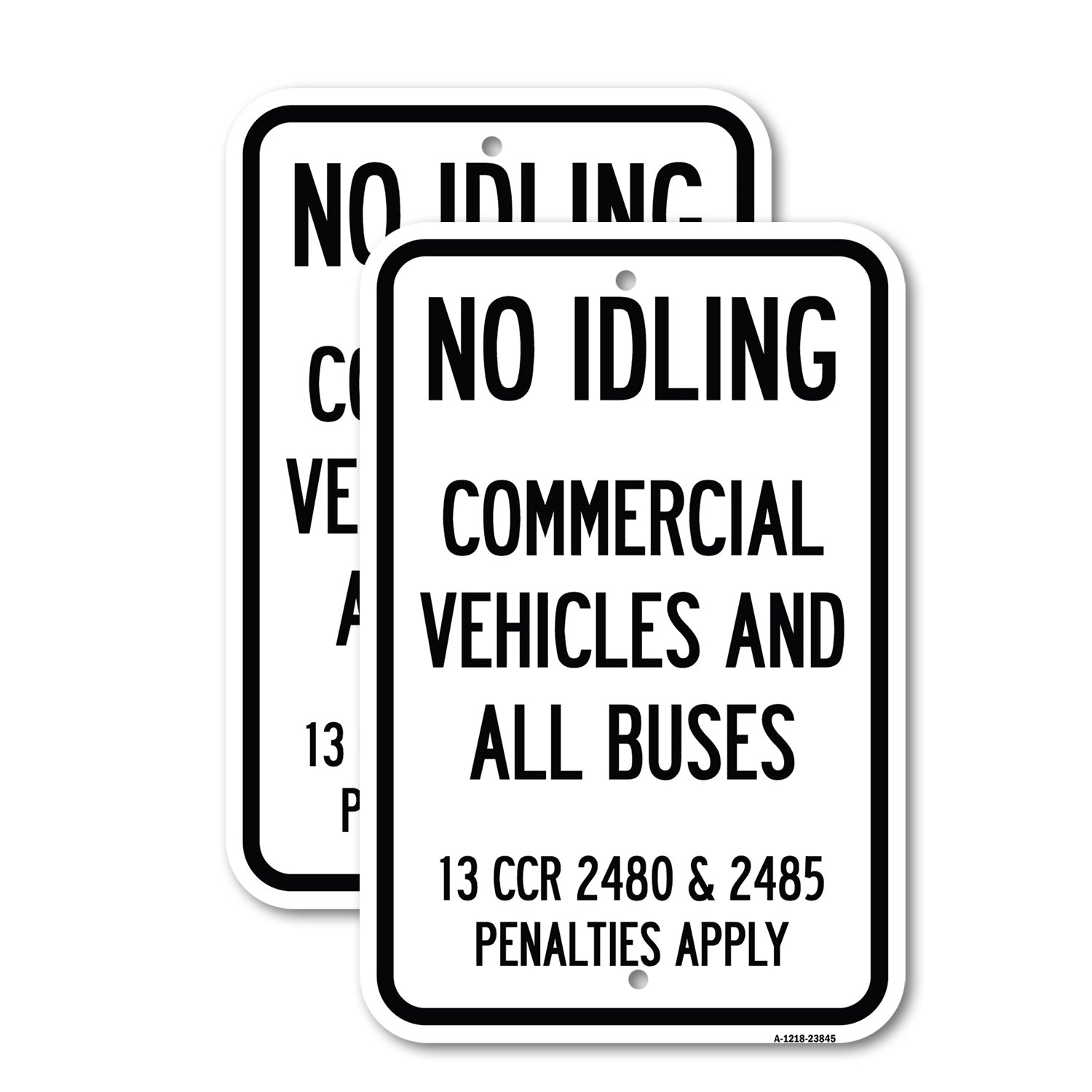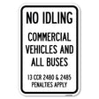 No Idling, Commercial Vehicles and All Buses, 13 CCR 2480 and 2485 Penalties Apply - 12" x 18" Heavy Gauge Aluminum Sign is backordered and will ship as soon as it is back in stock.