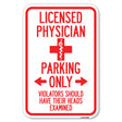Licensed Physician Parking Only, Violators Should Have Their Heads Examined - 12" x 18" Heavy Gauge Aluminum Sign is backordered and will ship as soon as it is back in stock.