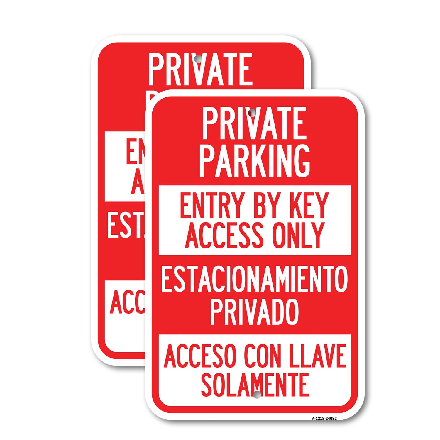 Entry by Key Access Only - Estacionamiento Privado Acceso Con Llave Solamente - 12" x 18" Heavy Gauge Aluminum Sign is backordered and will ship as soon as it is back in stock.