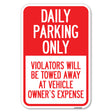 Daily Parking Only, Violators Will Be Towed Away at Vehicle Owner's Expense - 12" x 18" Heavy Gauge Aluminum Sign is backordered and will ship as soon as it is back in stock.