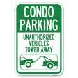 Condo Parking - Unauthorized Vehicles Towed Away (With Car Tow Graphic) - 12" x 18" Heavy Gauge Aluminum Sign is backordered and will ship as soon as it is back in stock.