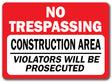 Construction Area Sign - No Trespassing Violators Prosecuted