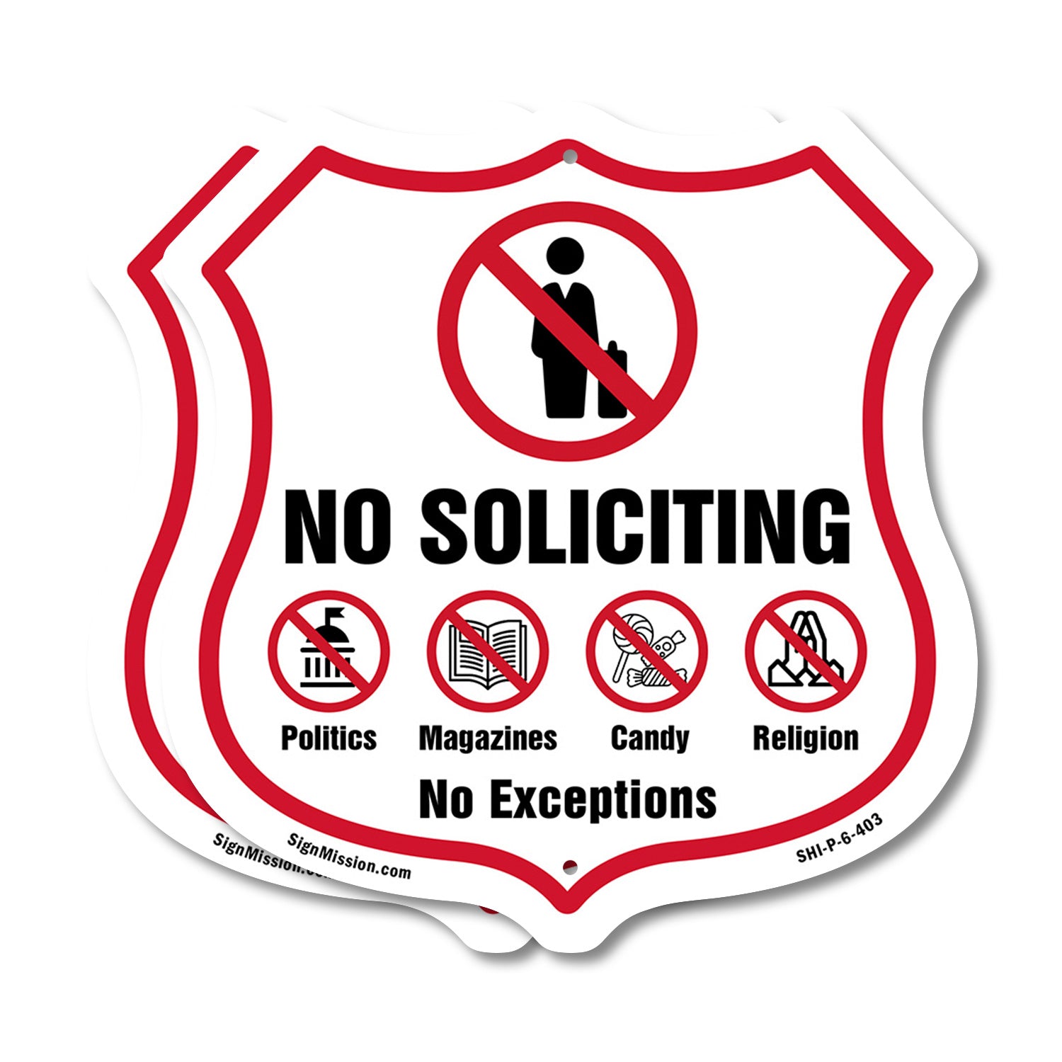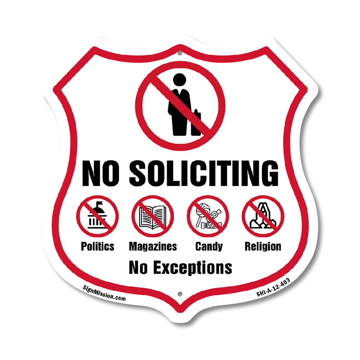 No Soliciting Shield Sign No Politics Magazines Candy Religion No Exceptions