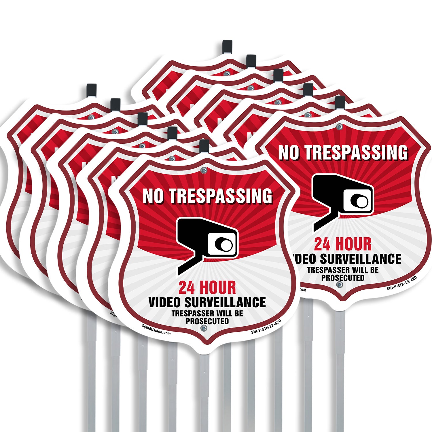 No Trespassing Shield Sign 24 Hour Video Surveillance Trespassers Will Be Prosecuted - Plastic Sign / 6 inch X 6 inch / Sign Only is backordered and will ship as soon as it is back in stock.