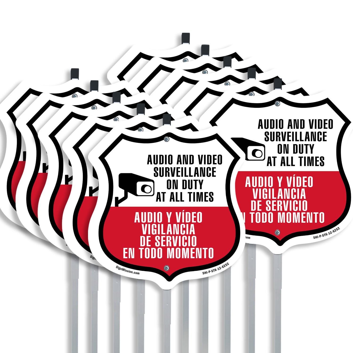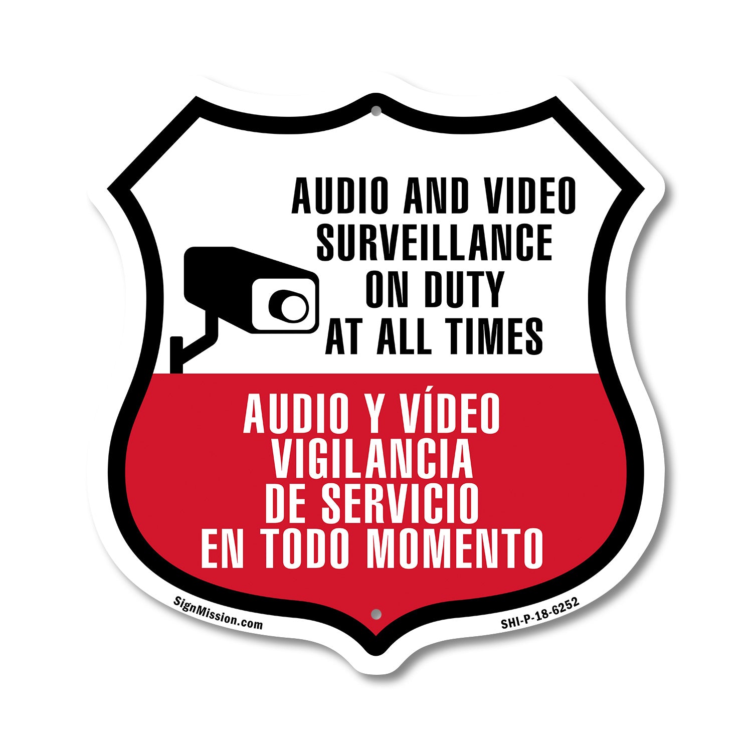 Audio & Video Surveillance On Duty At All Times Sign Bilingual English / Spanish - Plastic Sign / 6 inch X 6 inch / Sign Only is backordered and will ship as soon as it is back in stock.