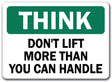 Think Safety Sign - Don't Lift More Than You Can Handle
