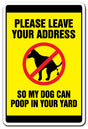 PLEASE LEAVE YOUR ADDRESS SO MY DOG CAN POOP IN YOUR YARD Sign